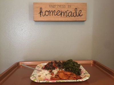 Organic Wild Rice with Parsley, chopped Portobello Mushrooms, Red bell peppers, Green bell peppers, Red Onions on top. Dandelion Leaf and Kale Greens...Sweet Potatoes!